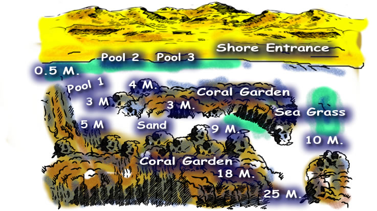 The Canyon is reached from the shore, by swimming over a shallow, sandy lagoon. Soon, you reach The Canyon which can be entered at a depth of around 20 metres. The Canyon is a long, narrow fissure in the coral reef. It is almost closed over at the top, making it an exciting site for cave enthusiasts. You can expect to see Pufferfish, Snappers and maybe, Octopus, amongst other marine life. You exit through a section of The Canyon known as ‘the fishbowl’ at a depth of 12 metres. |