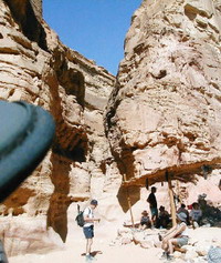 On the road to St. Catherines, you can turn off and head off across a stretch of sandy desert by 4-wheel drive until you reach the White Canyon. One is able to walk through the Canyon in the cool, winter months which then opens out at the Oasis of Ain Hudra, with its natural spring feeding the many date palms to be found there. A Bedouin community lives in the oasis and they are happy to provide their visitors with sweet Bedouin tea and lunch. |